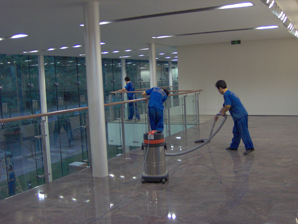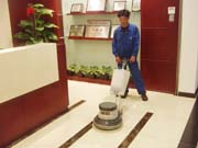 a 、清洗地面;使用多功能洗地機,配合吸塵吸水機及洗石水等保潔工具和藥劑進行清洗。